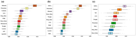 Feature selection results after excluding SOFA score, serum calcium, and serum albumin. (a): Boxplots displaying the distribution of feature importance scores after removing SOFA score; (b): Boxplots showing feature importance after excluding serum calcium; (c): Boxplots illustrating feature importance rankings following the exclusion of serum albumin.