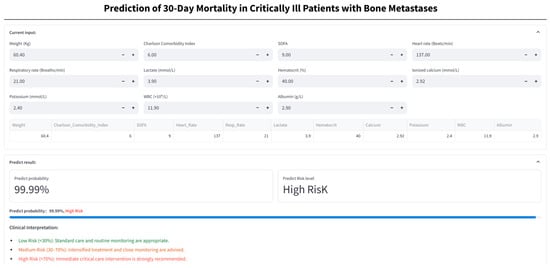 Web-based calculator for 30-day mortality risk in critically ill bone metastasis patients. Patient clinical variables are entered into the online calculator to generate the predicted probability of 30-day mortality and the corresponding risk stratification (low, medium, or high), and assist decision-making based on the assigned risk category.