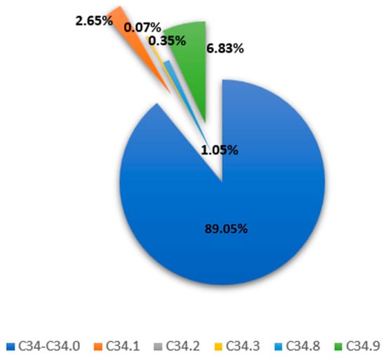 According to the nationwide prescription database, a total of 1188 patients with EGFR-positive and 246 with ALK-positive NSCLC initiated first-line therapy with at least one TKI during the three-year study period. (Table S1 in the Supplementary Material for ICD-10 codes and Figure S1 for the patient-flow diagram). The mean (SD) age of patients in the EGFR-positive cohort was 70.93 years (±11.16), while ALK-positive patients were younger, with a mean age of 64.26 years (±12.6). In terms of diagnostic classification, the majority of patients (approximately 89%) with at least one prescription were recorded under the ICD-10 code C34 and C34.0. This was followed by C34.9, which accounted for 6.83% of cases. The distribution of the most frequently recorded ICD-10 codes is presented in Figure 1.