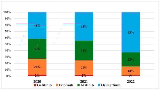 In parallel, the use of earlier-generation TKIs showed consistent declines. Afatinib, initially prescribed to 130 patients in 2020 (32%), dropped to 125 in 2021 and further declined to 82 (22%) in 2022. Erlotinib use similarly decreased from 24% in 2020 to 14% by 2022 (Figure 2). Gefitinib prescriptions were nearly phased out over the study period, falling below 2% by 2022, consistent with declining clinical preference and guideline revisions (Figure 2). It should be noted that no patients were found to have initiated first-line therapy with the second-generation EGFR TKI dacomitinib during the observation period. This finding is consistent with the fact that dacomitinib had not yet received reimbursement approval in Greece at the time of the study [17].