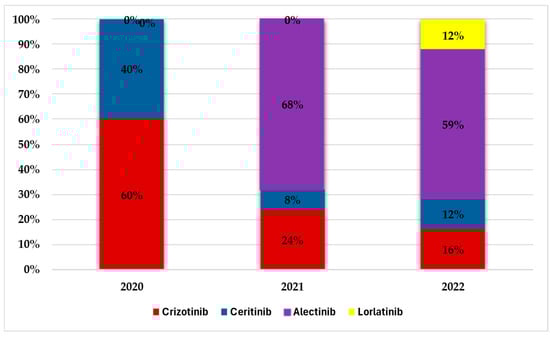 Treatment patterns for ALK-positive NSCLC patients evolved considerably over the study period, reflecting a clear shift toward the adoption of second-generation TKIs. In 2020, crizotinib was the most commonly prescribed agent, accounting for 60% of ALK TKI use, followed by ceritinib at 40%. Alectinib was not prescribed in 2020 indicating its limited availability or absence from reimbursement at that time, and lorlatinib had not yet entered clinical practice for this indication (Figure 3).
