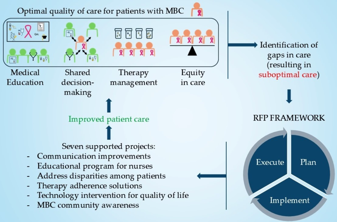 14]. To close gaps for MBC patients, the SPCC and Pfizer Global Medical Grants (Pfizer) implemented a unique framework, previously adopted by Pfizer in the US, for collaborating to offer a new grant opportunity seeking proposals in support of improving the care of MBC patients in Europe. Here, we report the unique framework that we applied to manage an RFP program to fill gaps for MBC patients in Europe and the results obtained by the grantees and their projects.