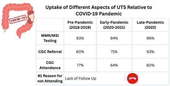 Based on the year of primary tumor resection relative to the COVID-19 pandemic, three cohorts were created, namely pre-(2018–2019), early-(2020–2021) and late-(2022). This grouping allowed for the creation of three distinct cohorts representative of three distinct periods of UTS performance relative to the COVID-19 pandemic: (1) “pre-pandemic” cohort to be representative of the baseline UTS performance before the pandemic; (2) “early-pandemic” cohort to be representative of the performance of the UTS while strict pandemic measures were still in place; and (3) “late-pandemic” cohort to be representative of the UTS performance when the majority of restriction measures were alleviated and vaccines were widely available. Patients were excluded if they (1) did not undergo resection of their primary tumor at UNC Medical Center in Chapel Hill; (2) did not have a pathological diagnosis of adenocarcinoma and (3) underwent resection of their primary tumor before the time period of interest. Eligibility for a referral to CGC was based upon the following: (1) abnormal IHC and/or MSI results (dMMR); (2) lack of MLH1 promoter hypermethylation, if MLH1 loss was detected; (3) EO CRC, defined as age < 50 years at diagnosis; and (4) absence of a known history of a hereditary cancer syndrome. According to the institutional protocol, schedulers were expected to make 3 attempts to reach referred patients. If patients could not be reached, this was documented in the patient’s EMR. Data on the performance rate of UTS, namely IHC and/or MSI testing, referral rate to CGC when indicated and attendance rates at CGC for the three study cohorts, pre-, early- and late-pandemic, were compared.
