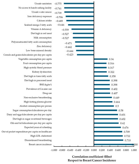 Positive correlations with breast cancer incidence were identified in 26 variables, suggesting factors potentially associated with increased risk at the population level. The strongest positive correlations were observed for discontinued breastfeeding (ρ = 0.733), high LDL cholesterol (ρ = 0.722), out-of-pocket healthcare expenditure per capita (ρ = 0.709), and expected years of schooling (ρ = 0.676). Other variables with moderate to weak positive correlations included oils and fats consumption (ρ = 0.620), sugar-sweetened beverage consumption (ρ = 0.602), dairy and eggs consumption (ρ = 0.601), alcohol consumption per person (ρ = 0.500), high fasting plasma glucose (ρ = 0.464), and non-exclusive breastfeeding (ρ = 0.449).