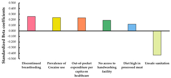 The variables included in Model 6 were discontinued breastfeeding, prevalence of cocaine use, unsafe sanitation, out-of-pocket healthcare expenditure per capita, lack of access to handwashing facilities, and a diet high in processed meat—all statistically significant at p < 0.05.