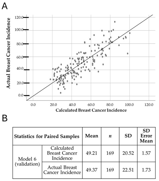 Breast Cancer Incidence = 29.396 + (0.893 × Discontinued Breastfeeding) + (7.273 × Prevalence of Cocaine Use) + (−0.369 × Unsafe Sanitation) + (0.013 × Out-of-pocket Expenditure per Capita on Healthcare) + (0.161 × No Access to Handwashing Facility) + (0.123 × Diet High in Processed Meat). Interpretation of the coefficients is as follows: Discontinued Breastfeeding: Each unit increase leads to an increase of 0.893 in breast cancer incidence. Prevalence of Cocaine Use: Each unit increase results in a rise of 7.273 in breast cancer incidence. Unsafe Sanitation: Each unit increase results in a decrease of 0.369 in breast cancer incidence. Out-of-pocket Expenditure on Healthcare: Each unit increase leads to an increase of 0.013 in breast cancer incidence. No Access to Handwashing Facility: Each unit increase contributes to an increase of 0.161 in breast cancer incidence. Diet High in Processed Meat: Each unit increase results in an increase of 0.123 in breast cancer incidence. Model validation showed a strong agreement between the predicted and actual values of breast cancer incidence, as illustrated in Figure 3A. Furthermore, a comparison of means using Student’s t-test (Figure 3B) revealed a negligible absolute difference of only 0.32% between actual and predicted values. This minimal deviation underscores the robustness and predictive accuracy of Model 6, confirming its suitability for estimating the behavior of breast cancer incidence based on the selected variables.