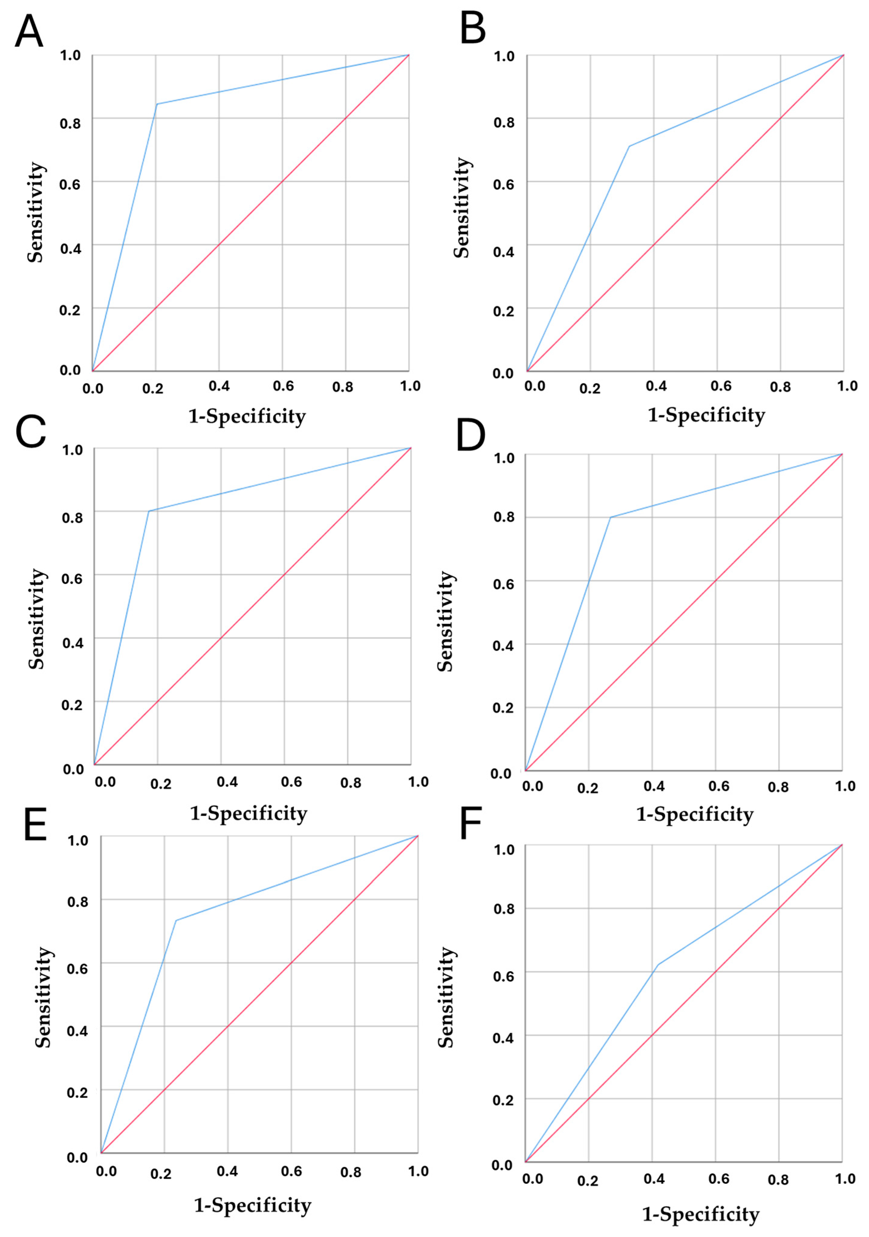 - Arredondo Montero, J.; Martín-Calvo, N. Diagnostic Performance Studies: Interpretation of ROC Analysis and Cut-Offs. Cirugía Española (Engl. Ed.) 2023, 101, 865–867. [Google Scholar] [CrossRef]
