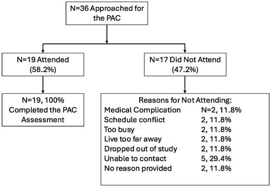 See Figure 1 for the flow of patients in this study. A total of 36 participants were approached to participate in the PAC and a total of 19 attended the clinic (52.8%). Of those who attended, 100% completed the assessment. There were no adverse events reported during the PAC. Reasons for not attending are included in Figure 1.