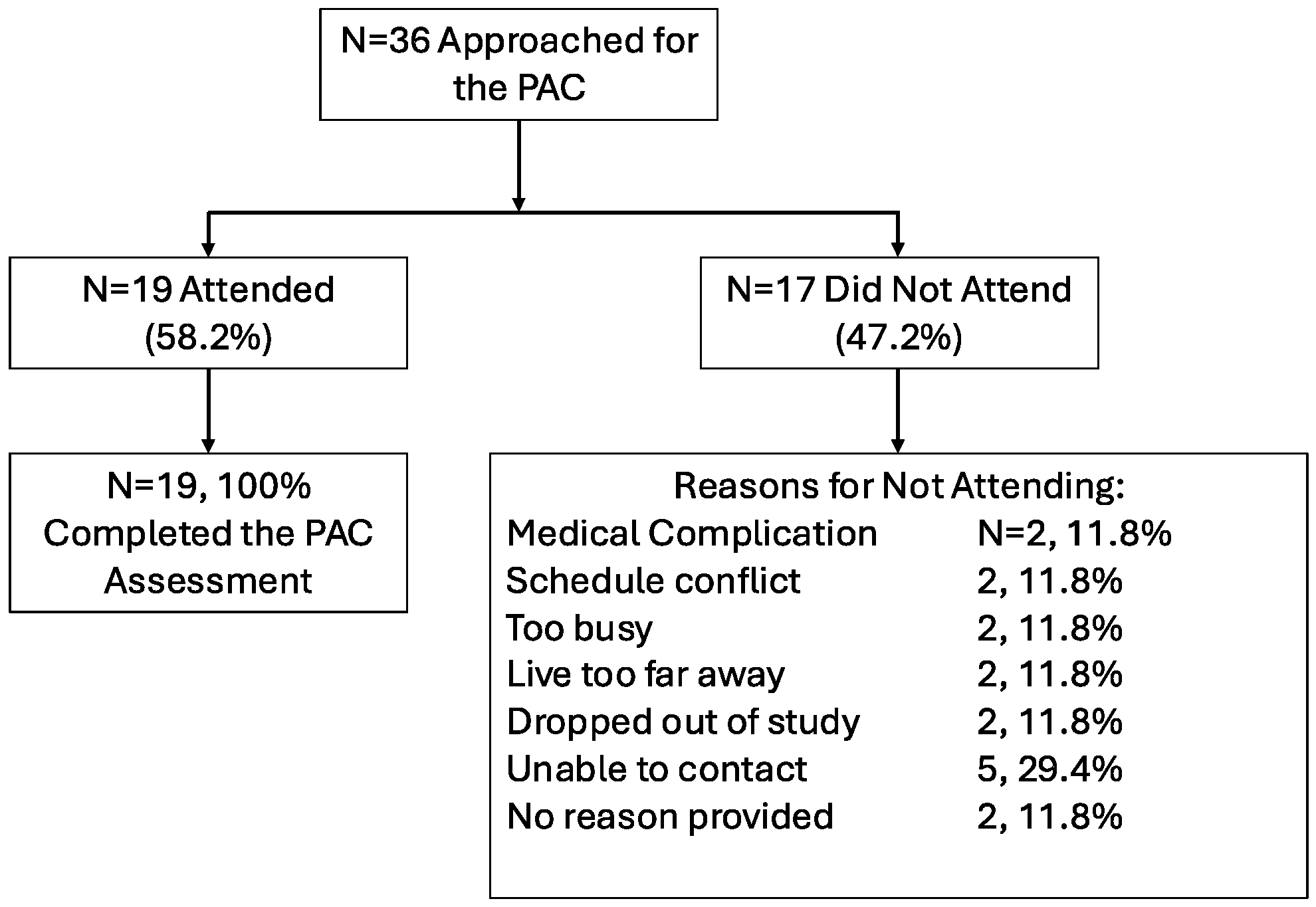 Clinical Characteristic | Total (n = 36) | Attended (n = 19, %) | Not Attended (n = 17, %) |