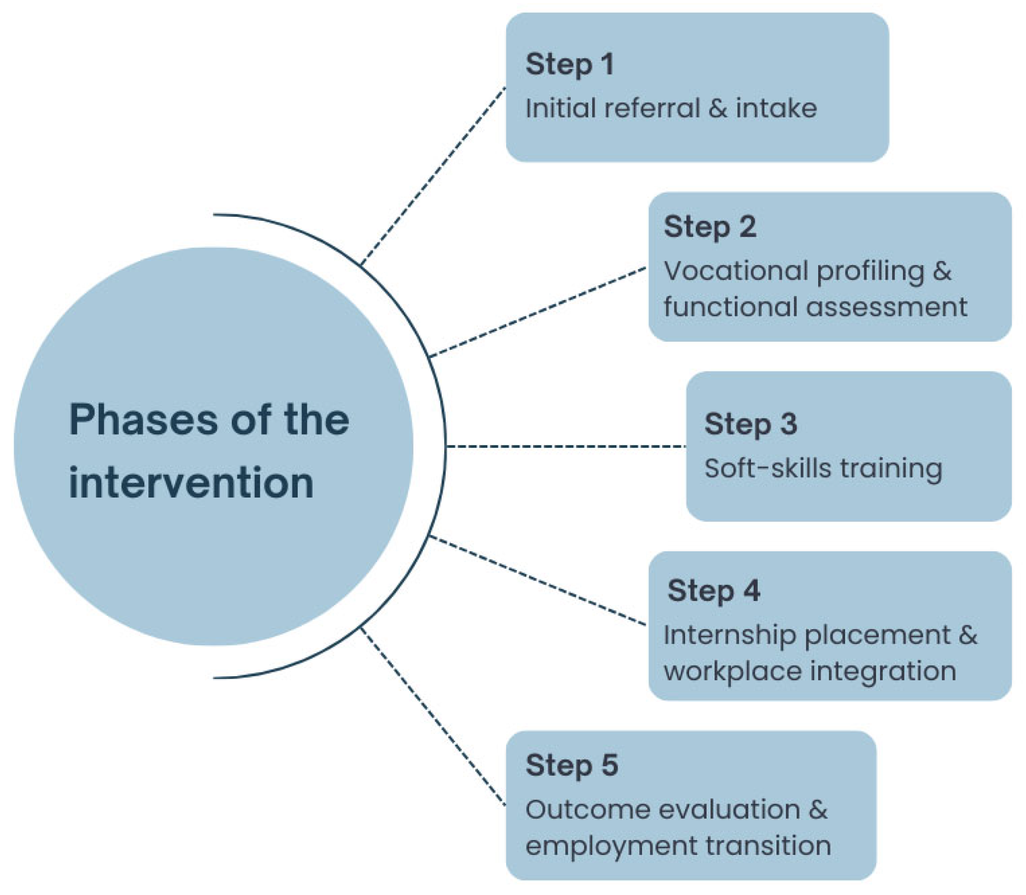 - Vocational profiling and functional assessment: An initial assessment phase is conducted, involving individualised vocational guidance, curriculum vitae development, functional and disability evaluations, and mapping of skills, interests, and employment-related barriers.