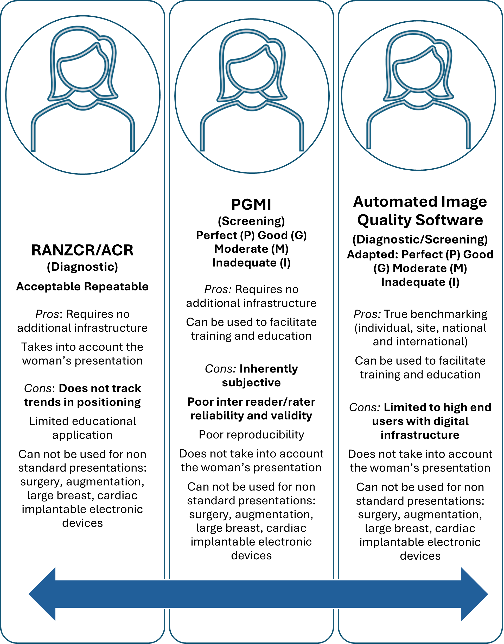Chan, A. et al., 2022; Australia/New Zealand Book Chapter [48] | Book Chapter | Book Chapter | Volpara TruPGMITM | Book Chapter | Book Chapter | Visual inspection of mammograms is subjective and time-consuming; consistent, objective, and ongoing feedback about breast positioning quality is challenging. Automated evaluation of breast positioning can: Allow individual review their of performance (overall and over time), as well as benchmark results against the facility and globally; Aid better understanding of performance, facilitate performance reviews and identify areas to target for training Support realistic objectives and goals based on benchmarking and individualised trends; Identify focus areas for improvement, by reviewing feedback down to the level of individual metrics; An automated approach to assessing positioning: Achieves and maintains a high standard of mammographic image quality; Provides an objective training program to advance positioning performance Facilitates external inspections and quality assurance programs |