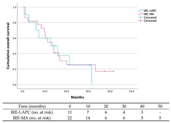 Figure 1. Overall survival of the IRE-LAPC group (n = 11) and the IRE-MA group (n = 22). The overall survival rate for the whole cohort was 27.3% after a 24-month follow-up period. In the IRE-LAPC group and IRE-MA group, overall survival was 27.3% and 27.3%, respectively. The median survival time across the cohort was 13.3 months (95% CI 9.3–17.1), with median survival times of 12.7 months (95% CI 0.8–24.5) for the IRE-LAPC group and 13.3 months (95% CI 9.1–17.5) for the IRE-MA group.