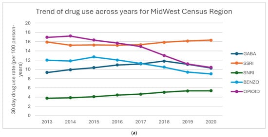 Figure 2a–d show the percentage of drug use for each region. Overall, BZD use decreases over time in all regions. All regions also saw notable declines in opioid use, with the Northeast showing the most significant reduction. From 2013 to 2018, all regions had a steady increase in GABA use, with a decline in use in 2020. SSRI use was fairly stable across all regions, with a slight increase in both SSRI and SNRI use. The South shows a higher prescribing pattern across all the drugs compared to West, Northeast, and Midwest regions.