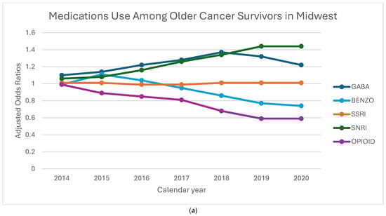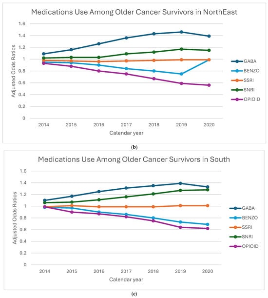 The following supporting information can be downloaded at: https://www.mdpi.com/article/10.3390/curroncol32100576/s1, Table S1: Adjusted Odds Ratios (aOR) and 95% Confidence Intervals (CI) for the Receipt of GABA, Benzodiazepine, SSRI, SNRI, and Opioid Medications Among Older Cancer Survivors by regions. p-value interaction between region and calendar year is <0.0001.