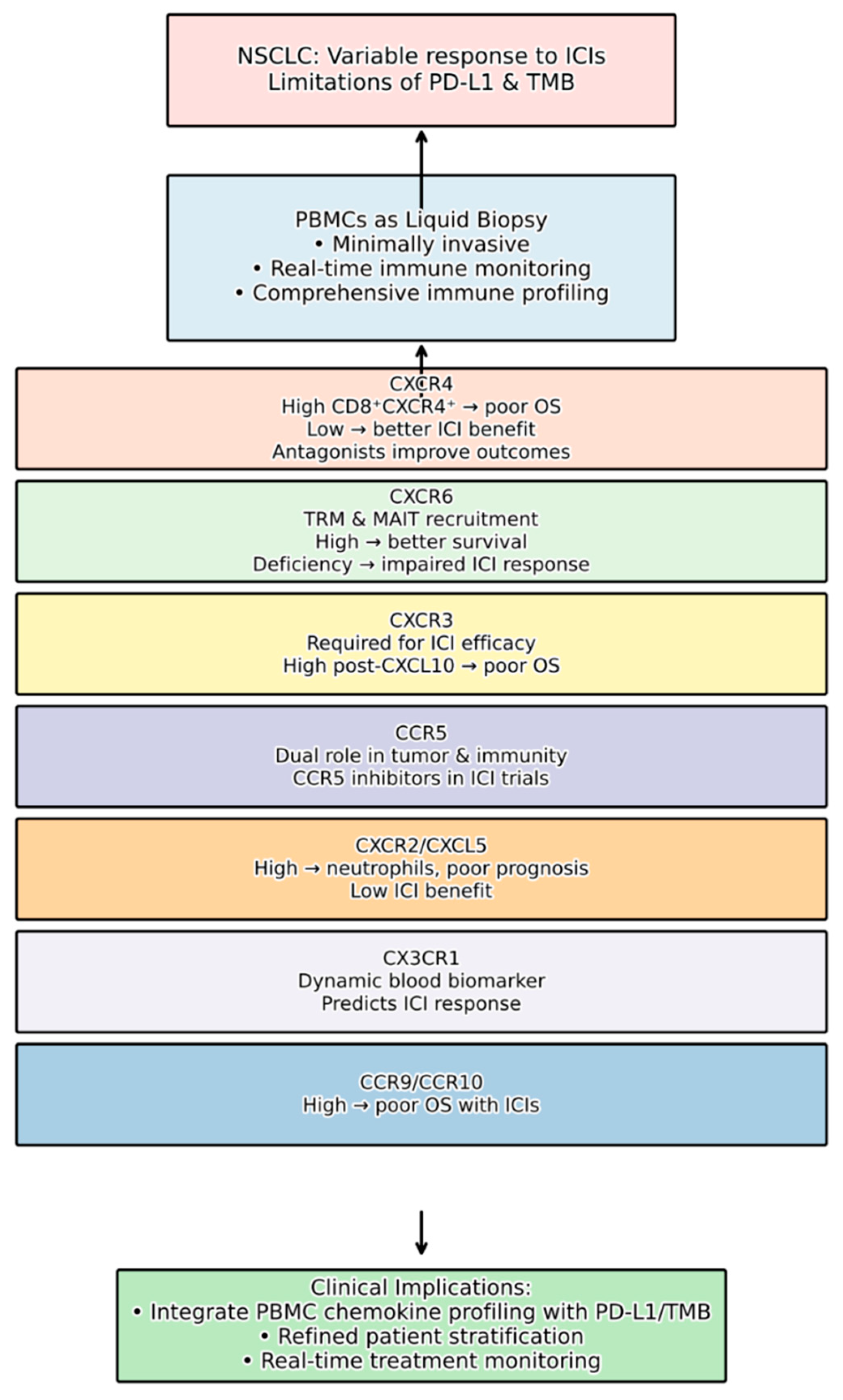 - Other chemokine receptors, such as CXCR3, CCR5, CXCR2, CCR9, CCR10, and CX3CR1, also exhibit significant associations with NSCLC progression and response to immunotherapy. For instance, while intratumoral CXCR3 activity is required for anti-PD-1 efficacy, high post-treatment CXCL10 (CXCR3 ligand) correlates with poor overall survival. High circulating levels of CD4+ CCR9+ and CD4+ CCR10+ T cells are linked to poorer outcomes in ICI-treated NSCLC patients. The CXCL5/CXCR2 axis, characterized by neutrophil infiltration, is associated with unfavorable immunotherapy responses and poor prognosis. CX3CR1 expression on circulating CD8+ T cells also holds promise as a dynamic blood-based biomarker.