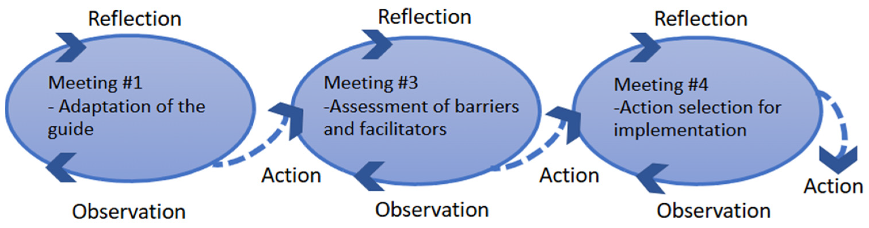This research is based on the participatory action research approach [29]. This research approach engages both researchers and knowledge users in a reflective process that generates useful and accurate knowledge, aligned with the users’ realities and needs, while also identifying practical solutions to common challenges [29,30]. This approach fosters synergy through partnerships with knowledge users, including individuals living beyond hematological cancer, HCPs, and managers, which enabled us to conduct the study in a way that was both culturally appropriate for the target population and logistically feasible [31]. A distinctive feature of the participatory research approach is its use of reflexive cycles during data collection, which involve observation (describing/defining), reflection (analyzing/interpreting), and action (identifying solutions). Figure 1 illustrates how these cycles were integrated into our data collection process.
