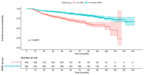 Low SMRA was a predictor of worse OS, demonstrating significant associations in both univariate (HR 2.58, 95% CI 1.92–3.39, p < 0.001) and multivariable analyses (HR 2.13, 95% CI 1.58–2.88, p < 0.001). These findings were consistent with Kaplan–Meier analysis (Figure 1). Low SMA was also associated with reduced OS in univariate analysis (HR 1.46, 95% CI 1.09–1.96, p = 0.01) (Supplementary Figure S2) and in the multivariable model (HR 1.53, 95% CI 1.06–2.20, p = 0.02). Model discrimination was moderate (c-index 0.69, 95% CI 0.65–0.72). No significant violation of proportional hazards was observed (global Schoenfeld test p = 0.45). No significant interactions were observed between SMA or SMRA and sex or T stage, except for SMA × T stage (p = 0.02) (Supplementary Table S4b). In the subset with known HPV status, neither low SMA (HR 1.72, 95% CI 0.82–3.61, p = 0.15) nor low SMRA (HR 1.28, 95% CI 0.74–2.22, p = 0.37) retained prognostic significance (Supplementary Table S5).