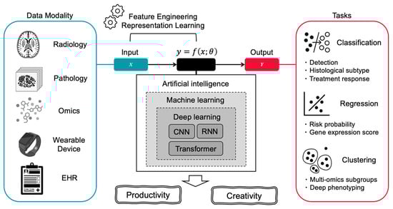 The integration of AI into clinical oncology is propelled by two related forces. First, breakthroughs in computational methods, particularly deep learning (DL), have produced multilayer artificial neural networks capable of detecting subtle patterns in extensive biomedical datasets that often escape human perception. Second, the digital transformation of healthcare has matured, with routine electronic health records (EHRs), whole-slide imaging (WSI) in pathology, and standardized genomic profiling now yielding longitudinal, high-quality datasets for training and validating AI models [,,,,,]. This creates a self-reinforcing data–AI loop: expanding datasets enable better models, whose finer-grained outputs become new data, further increasing the need for intelligent systems.