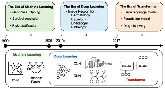 ML forms the foundation of modern AI. Since the 1990s, ML has allowed computers to learn from examples rather than from handwritten rules for each task. In oncology, traditional ML models, such as support vector machines (SVM), decision trees, and random forests, have supported tumor classification, survival prediction, and risk stratification using structured clinical or genomic data [,,,]. However, a key limitation is the need for manual feature engineering, which requires domain expertise and limits scalability for unstructured inputs.
