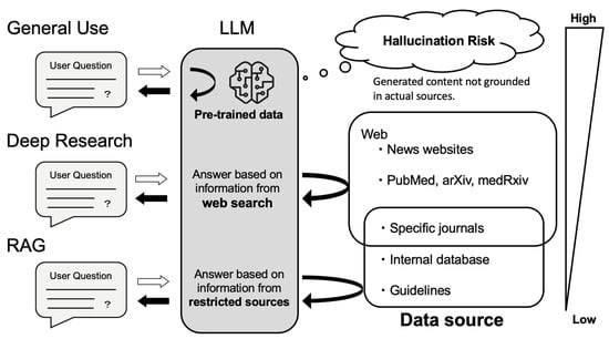 How LLMs Answer Questions: Source Dependency and Hallucination Risk. General use relies solely on pre-trained data, which may result in hallucinations when content is not grounded in actual sources. Deep research mode performs real-time searches across openly available sources such as news websites, PubMed, arXiv, and medRxiv, allowing access to more recent but not necessarily curated information. Retrieval-augmented generation (RAG) answers questions based on specified, high-quality sources—including specific journals, internal databases, and clinical guidelines—thus providing the most reliable responses by constraining outputs to verified and authoritative content.