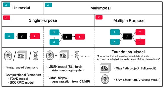 Classification of AI Models by Input Modality and Output Task Multiplicity. Framework for categorizing AI models in oncology based on data modality (unimodal vs. multimodal) and task scope (single vs. multiple purpose). Examples include image-based diagnosis and computational biomarkers (TOAD, SCORPIO) for unimodal applications; MUSK model (Stanford vision-language system) and virtual biopsy for multimodal single-purpose tasks; and foundation models (GigaPath, SAM) that leverage multimodal inputs for multiple downstream applications. This classification illustrates the evolution toward integrated, versatile AI systems in precision oncology.