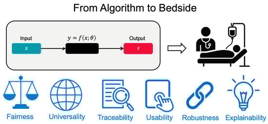 - Lekadir, K.; Frangi, A.F.; Porras, A.R.; Glocker, B.; Cintas, C.; Langlotz, C.P.; Weicken, E.; Asselbergs, F.W.; Prior, F.; Collins, G.S.; et al. FUTURE-AI: International Consensus Guideline for Trustworthy and Deployable Artificial Intelligence in Healthcare. BMJ 2025, 388, e081554. [Google Scholar] [CrossRef] [PubMed]