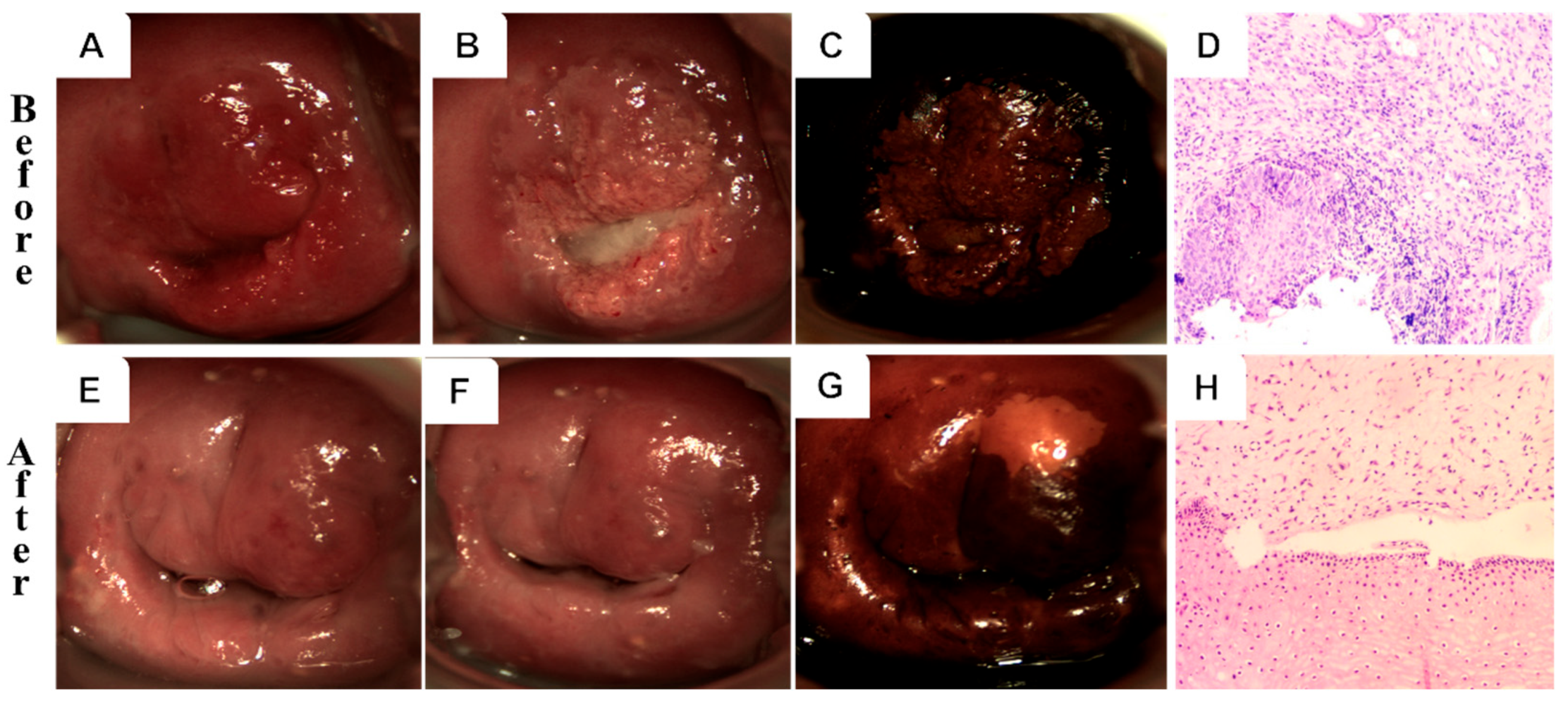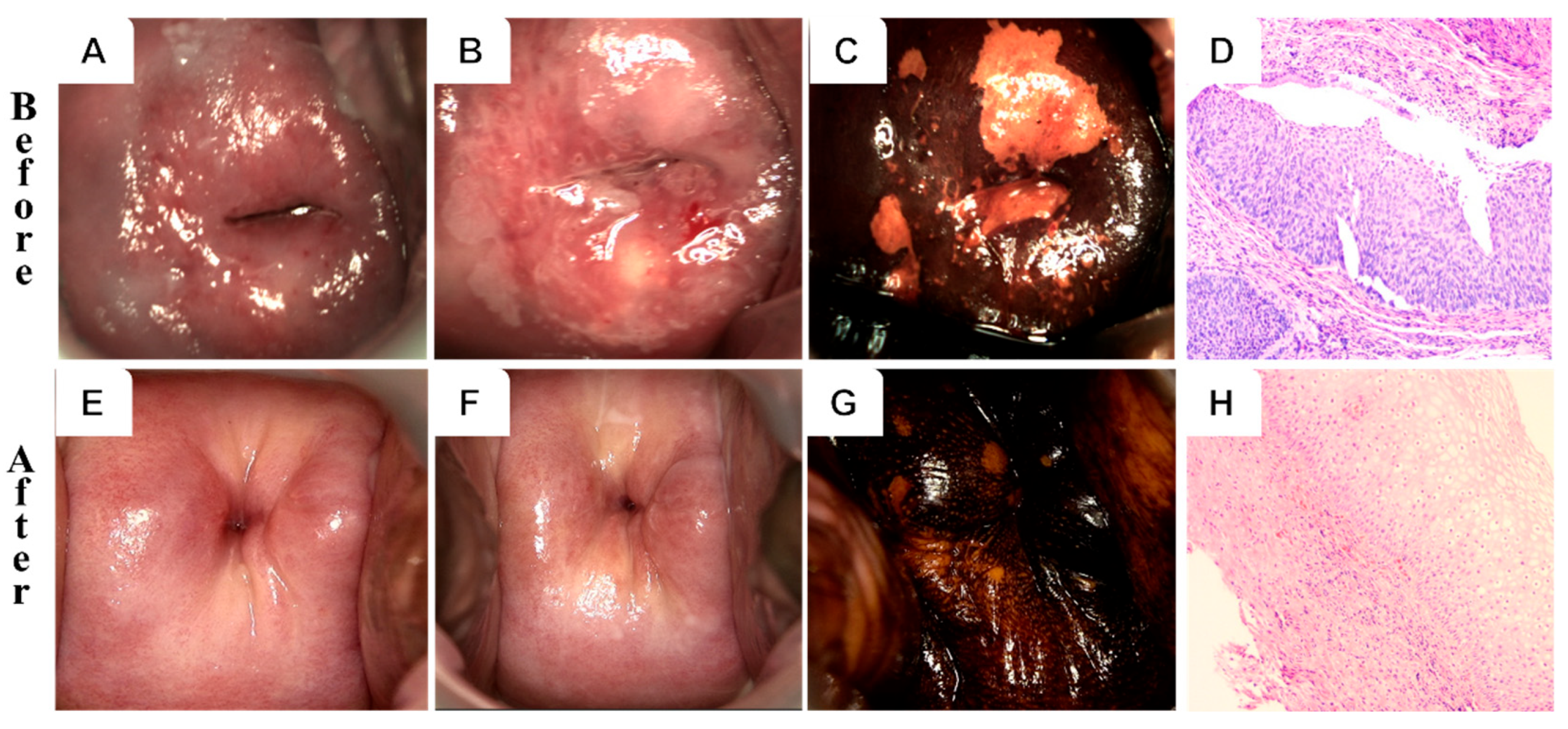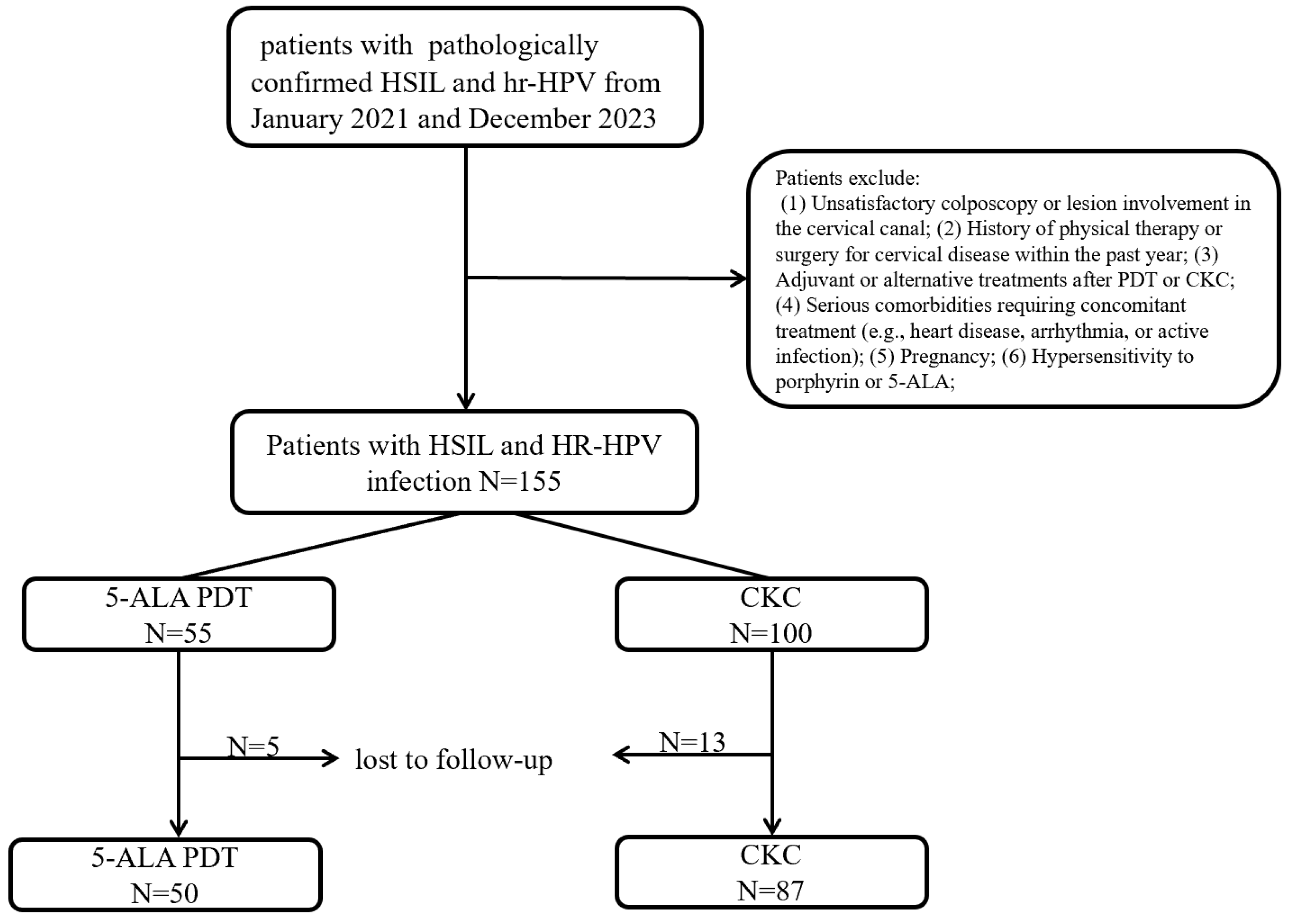 - Wei, Y.; Gu, L.; Zhang, Y.; Yang, Q.; Chen, F.; Hong, Z.; Di, W.; Qiu, L. Efficacy of ALA-PDT in treating cervical low-grade squamous intraepithelial lesions with high-risk HPV patients: A multicentre randomized controlled trial. Int. J. Cancer 2025, 157, 908–915. [Google Scholar] [CrossRef]