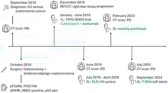 She underwent hysterectomy with bilateral salpingo-oophorectomy, pelvic lymph node dissection, and infracolic omentectomy. Pathology revealed synchronous left ovarian involvement, with a definitive stage of pT3aN0, FIGO IIIA according to the 2009 classification. A molecular report returned a dMMR profile with a concurrent p53 abnormal immunohistochemical pattern and an overexpression of HER2 defined as 3+ by IHC according to gastric criteria. The following patient’s disease course with treatments is illustrated in Figure 1.
