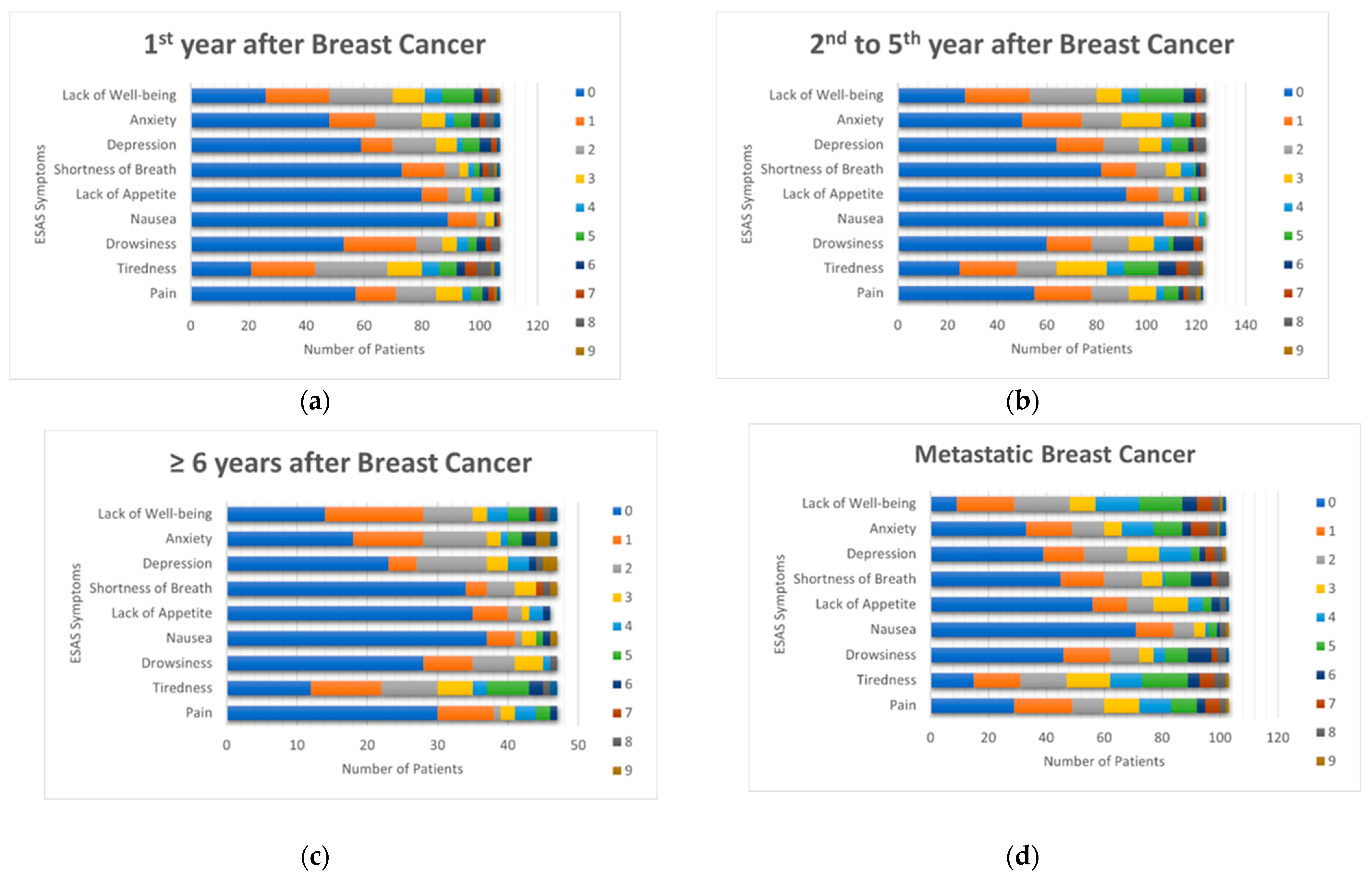 | ESAS Symptoms (Moderate to Severe Scores, 4–10) | 1st Year After Primary Breast Cancer (N = 107) | 2nd to 5th Year After Primary Breast Cancer (N = 124) | ≥6 Years After Primary Breast Cancer (N = 47) | Metastatic Breast Cancer (N = 103) | Total (N = 381) |