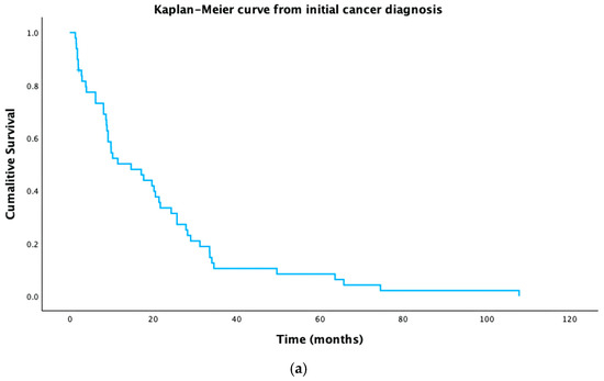 Following stent insertion, 45 patients (92%) survived to discharge from hospital. From cancer diagnosis, median survival was 14.7 months (IQR: 6.2–28.2 months). One patient was not included in the analysis due to an unclear date of diagnosis. The Kaplan–Meier analysis is presented in Figure 1a.