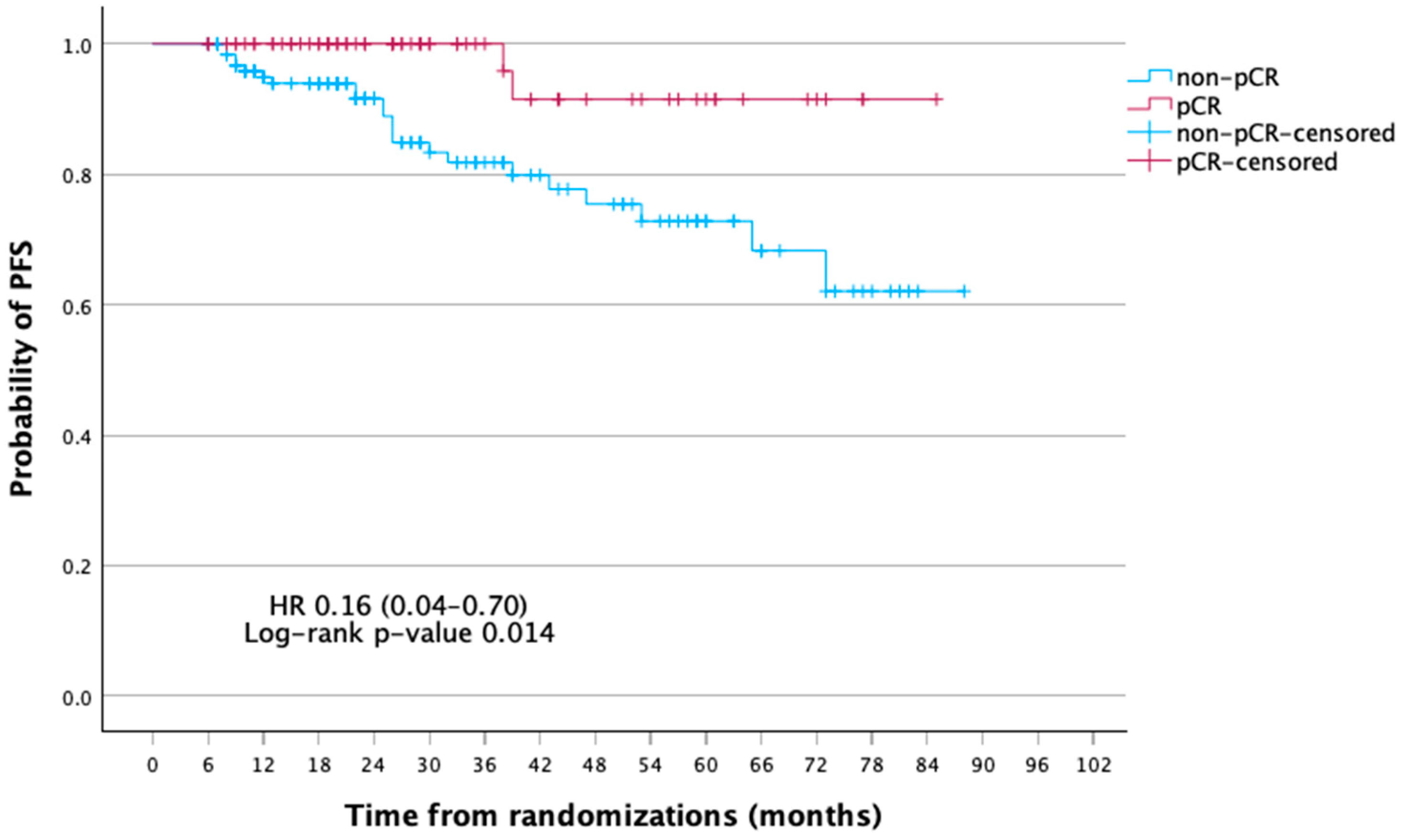 - Cortazar, P.; Zhang, L.; Untch, M.; Mehta, K.; Costantino, J.P.; Wolmark, N.; Bonnefoi, H.; Cameron, D.; Gianni, L.; Valagussa, P.; et al. Pathological complete response and long-term clinical benefit in breast cancer: The CTNeoBC pooled analysis. Lancet 2014, 384, 164–172. [Google Scholar] [CrossRef]