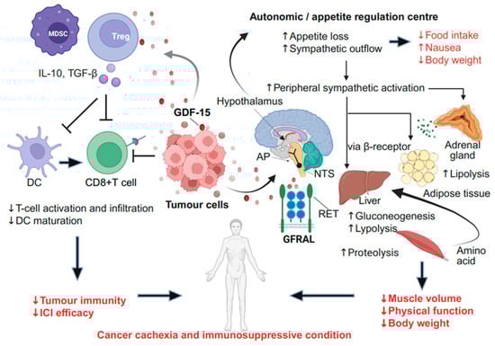 Mechanism of GDF-15-mediated cancer cachexia and suppression of tumour immunity. GDF-15 is produced by tumour cells and interferes with immune cells in the tumour microenvironment through paracrine signalling. GDF-15 inhibits T-cell infiltration and activation through direct or indirect mechanisms, leading to immune escape. It is transported via circulation to the AP (vomiting centre) and the NTS of the brainstem, where its receptor, GFRAL, is expressed. This process mediates cachexia related symptoms (nausea and anorexia) and activates the sympathetic nervous system, ultimately leading to the development of cancer cachexia. Furthermore, activated sympathetic flow interferes with tumour immunity by exerting an inhibitory effect (not illustrated here). This figure was created using BioRender (https://BioRender.com). AP, area postrema; DC, dendritic cell; GDF-15, growth differentiation factor 15; GFRAL, GDNF family receptor alpha-like; IL-10, interleukin-10; NTS, nucleus tractus solitarius; RET, rearranged during Transfection; TGF-β, transforming growth factor beta. Arrows indicate the direction of biological effects or signalling flow, whereas T-shaped lines represent inhibitory interactions.