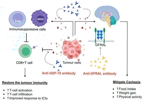 Overall, GDF-15 plays a critical role in suppressing T-cell function and contributes to an ‘immune-cold’ tumour phenotype. This immunosuppressive function likely plays a protective role in certain physiological contexts [,]. Clinically, autoimmune disease activity diminishes during pregnancy, although the underlying mechanisms remain unclear []. The negative immunomodulatory effects of GDF-15, along with its elevated production by the placenta during pregnancy, may help explain this phenomenon. Conversely, elevated GDF-15 levels in the TME inhibit the host immune response against tumours, facilitating immune escape and contributing to resistance to immunotherapies, including ICIs []. ICIs are central to modern treatments of various cancer types. However, response rates to ICI monotherapy are typically modest or moderate [,,,], except in certain cancer types [,,]. Therefore, combination therapies with chemotherapy, molecularly targeted therapies, or other immunotherapies have been widely clinically adopted or explored in clinical trials [,].