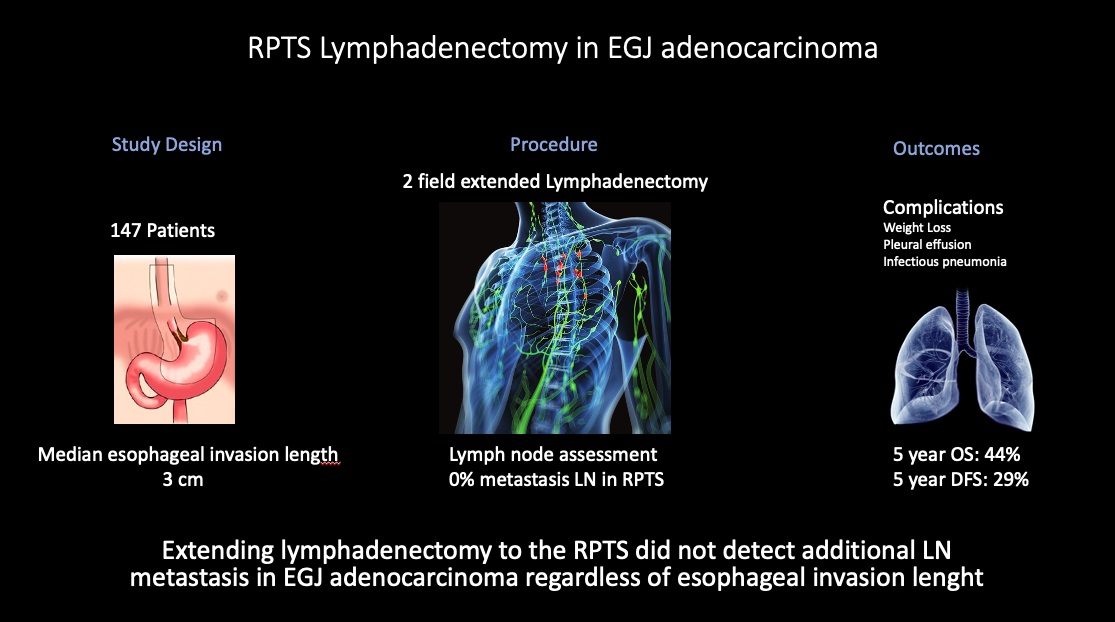 The main objective of this study was to analyze the rate of RPTS LN involvement in patients with EGJ adenocarcinoma. Secondary objectives were to analyze correlations with esophageal length invasion (<4 cm vs. ≥4 cm) and to evaluate the impact of extending lymphadenectomy to the RPTS on survival and postoperative complications.