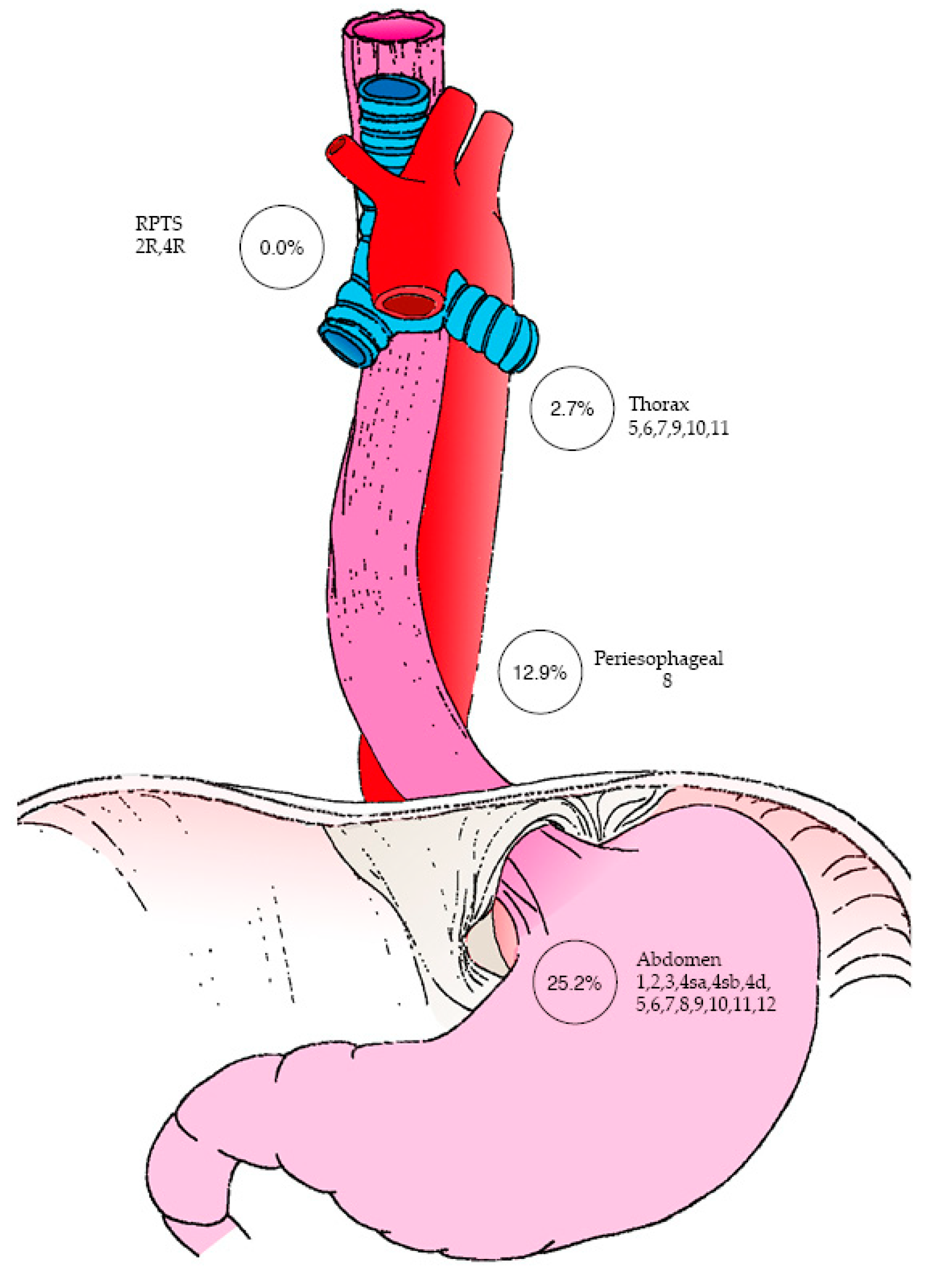 Concerning RPTS LN status, none of the patients (0%) in the cohort had LN involvement on final pathology analysis. Regarding the pathological status of other LN stations (Figure 1), thoracic LNs (stations 5, 6, 7, 9, 10, and/or 11) were found to be metastatic in 14.3% of patients, with 12.9% of these cases involving peri-esophageal LNs (station 8). Additionally, abdominal LNs—including perigastric, hepatic, and splenic stations (1, 2, 3, 4sa, 4sb, 4d, 5, 6, 7, 8, 9, 10, 11 and/or 12)—were involved in 25.2% of patients.