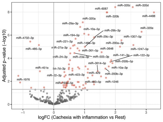 Volcano plot showing differentially expressed miRNAs when comparing patients with cachexia and inflammation with the rest of the patients. The x-axis shows the fold-change values (log2) when comparing the two groups. The y-axis shows the inverse adjusted p-values (−log10). Selected miRNAs are indicated by name. Red indicates significance (Benjamini–Hochberg-adjusted p-value < 0.05). See Supplementary Table S3 for a list of the differentially expressed miRNAs and their p-values.