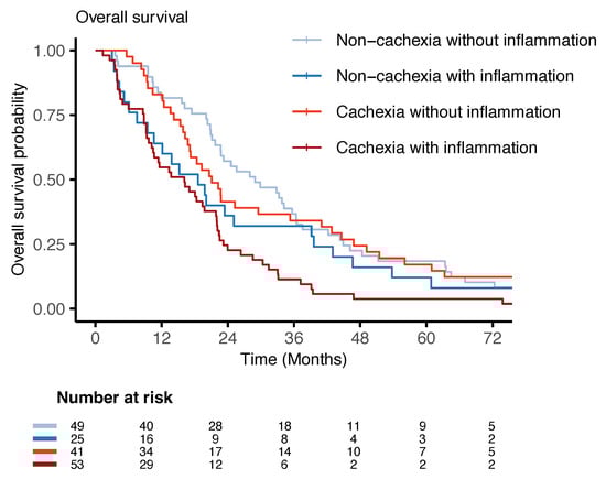 Overall survival plot: Kaplan–Meier survival curves for patients with non-inflammatory non-cachexia, inflammatory non-cachexia, non-inflammatory cachexia, and inflammatory cachexia. The risk table shows the number of individuals at risk at the different time intervals.