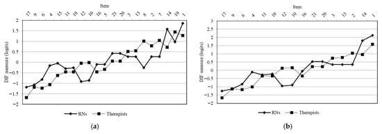 DIF by profession (therapists and nurses). The diagram (a) shows the results of the first Rasch analysis. The diagram (b) shows the results of the second Rasch analysis. The items on the x-axis are arranged in order of decreasing item difficulty (logit value) from left to right. The y-axis indicates the logit value. DIF: differential item function; RN: registered nurse.