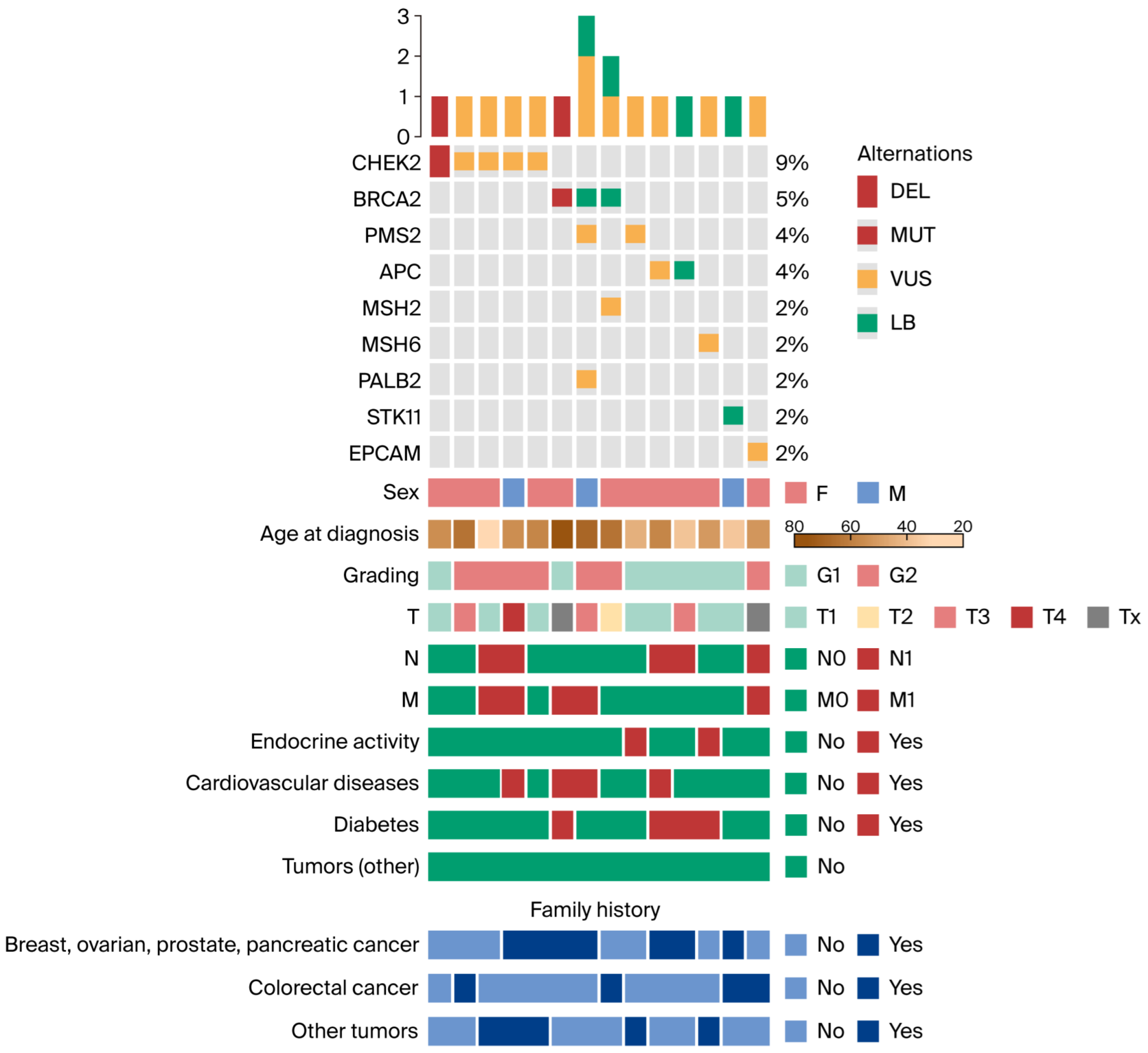 | 1 | CHEK2 c.(908+1_909-1)_(1095+1_1096-1)del | G1, pT1N0M0 | 50 | 16 |