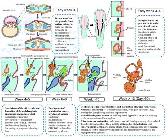 Embryological Development of the Human Inner Ear and Associated Malformations. This figure illustrates the morphological progression of the human inner ear from embryonic week 3 to beyond week 13. It sequentially depicts the formation of the otic placode, invagination and differentiation of the otic vesicle, development of the semicircular canals and cochlea, and establishment of the endolymphatic system. Developmental anomalies and associated disorders are annotated at corresponding stages, providing insight into the temporal and structural origins of congenital inner ear malformations.
