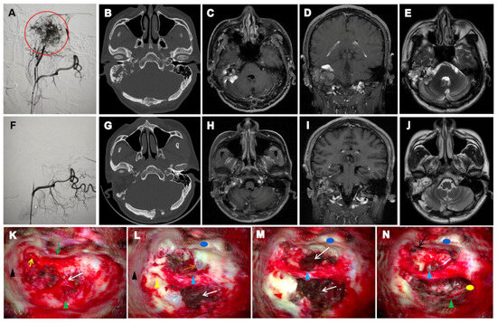 Preoperative and postoperative imaging and intraoperative findings of ELST in case 1. (A): DSA shows that the lesion is primarily supplied by branches of the right external carotid artery. A dense vascular nidus is visualized with a clustered appearance (red circle). (F): Post-embolization DSA demonstrates a marked reduction in lesion vascularity. Residual perfusion is observed in several small feeding branches, with mild residual enhancement at the lesion margin. (B): Axial CT demonstrates erosive bone destruction involving the right petrous bone and mastoid, with expansion of the IAC. Peripheral ring-like calcification and spiculated calcifications within the tumor matrix are evident. (G): Postoperative CT shows changes consistent with complete tumor resection. The surgical cavity has well-defined margins. (C–E): Preoperative contrast-enhanced T1-weighted MRI reveals a heterogeneously enhancing, irregular lesion involving the right petrous bone, ELS, mastoid, and IAC, partially extending into the CPA. T2-weighted images show a hyperintense lesion with irregular peripheral enhancement. (H–J): Postoperative contrast-enhanced T1-weighted MRI shows postoperative changes in the right petrous bone. Patchy enhancement is seen within the surgical cavity, likely representing postoperative scar tissue. No definitive signs of recurrence are observed. (K–N): Intraoperative views during ELST resection. Tegmen tympani (black triangle); Short process of the incus (yellow arrow); Posterior wall of the external auditory canal (green arrow); Anterior wall of the external auditory canal (blue circle); Dura of the posterior cranial fossa (green triangle); Internal carotid artery (orange arrow); Pharyngeal orifice of the Eustachian tube (black arrow); Residual bony labyrinth (yellow triangle); FN (blue triangle); ELST (white arrow); Posterior fossa dura (green triangle); Surface of the jugular bulb (yellow circle).