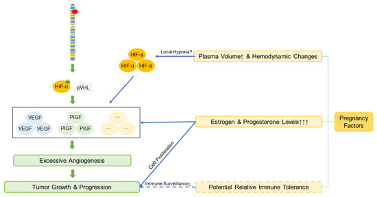 The mechanism by which pregnancy promotes the growth and progression of VHL-associated tumors. Pregnancy-associated factors synergize with the increased HIF caused by VHL gene mutations, accelerating angiogenesis and thereby promoting tumor growth and progression. The solid lines represent the established mechanisms, while the dashed lines represent the hypothesized mechanisms. Definitions of abbreviations are provided in the main text.