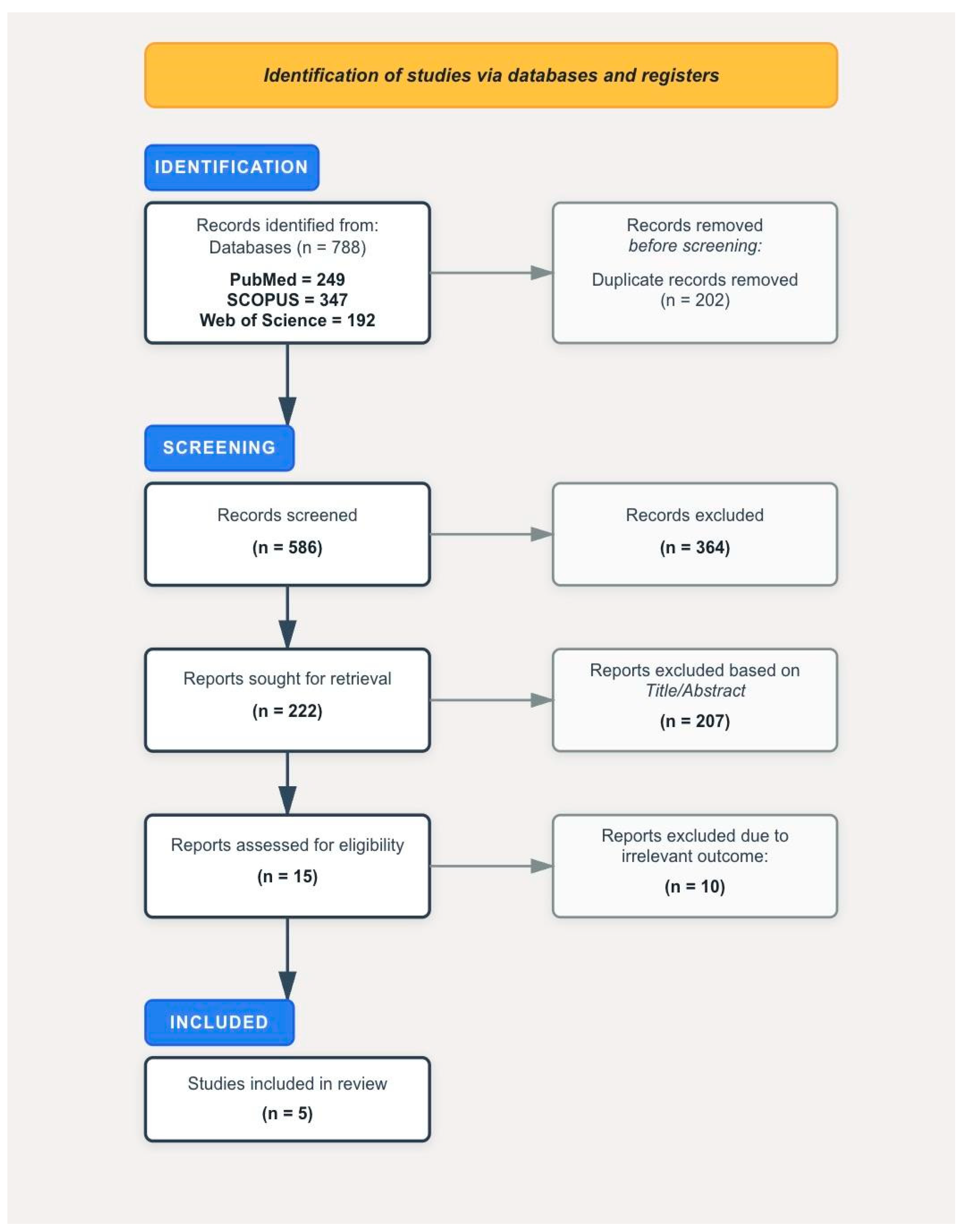 In August 2025, we conducted a systematic search of PubMed/MEDLINE, Scopus, and Web of Science, initially yielding 788 records. Following duplicate removal, title/abstract screening, eligibility assessment, and full-text screening, five studies met the inclusion criteria (
