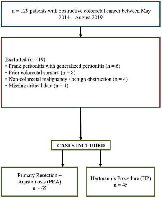 Flow diagram showing patient selection process and allocation to surgical procedures. Of 129 patients presenting with obstructing colorectal cancer, 19 were excluded due to predefined criteria, leaving 110 eligible cases. These were divided into the Primary Resection and Anastomosis (n = 65) and Hartmann’s Procedure (n = 45) groups for analysis.