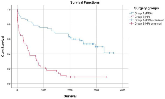 Patients in the PRA cohort experienced significantly shorter hospital stay (8.7 ± 4.1 vs. 11.2 ± 5.2 days, Cohen’s d = 0.55, p = 0.02) and had lower complication rates (33% vs. 66%, OR = 0.26 p = 0.003). Patients in the PRA group had significantly better survival outcomes, with a mean survival duration of 1969 ± 1113 days compared with 626 ± 759 days for the HP cohort (p = 0.001).