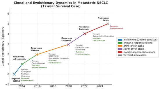 Background: Non-small cell lung cancer (NSCLC) is the most common form of lung cancer and a leading cause of cancer-related death. Despite therapeutic advances, long-term survival in stage IV disease is uncommon. Tumor analyses that combine genomic and functional platforms may provide the opportunity to monitor clonal dynamics and guide therapy selection. Case Presentation: We report a 67-year-old woman with metastatic poorly differentiated lung adenocarcinoma, who achieved four durable remissions and survived nearly 12 years. Serial studies using ex vivo analysis of programmed cell death (EVA/PCD) functional-profiling-guided therapeutic choices were correlated with next-generation sequencing (NGS). Molecular events included the emergence of a BRAF V600E mutation responsive to dabrafenib plus trametinib and the acquisition of an EGFR exon 19 deletion responsive to Osimertinib. EVA/PCD identified activity for targeted agents and revealed synergy for vinorelbine plus Osimertinib not predicted by genomic profiling, which provided additional response. Discussion: This case highlights clonal evolution in NSCLC and illustrates how serial tissue analyses correlating phenotypic and genomic events can offer therapeutic interventions to provide long-term survival. Conclusions: The integration of functional and genomic profiling may improve personalized treatment in NSCLC by interrogating tumor heterogeneity and clonal evolution to inform rational therapeutic selection.
