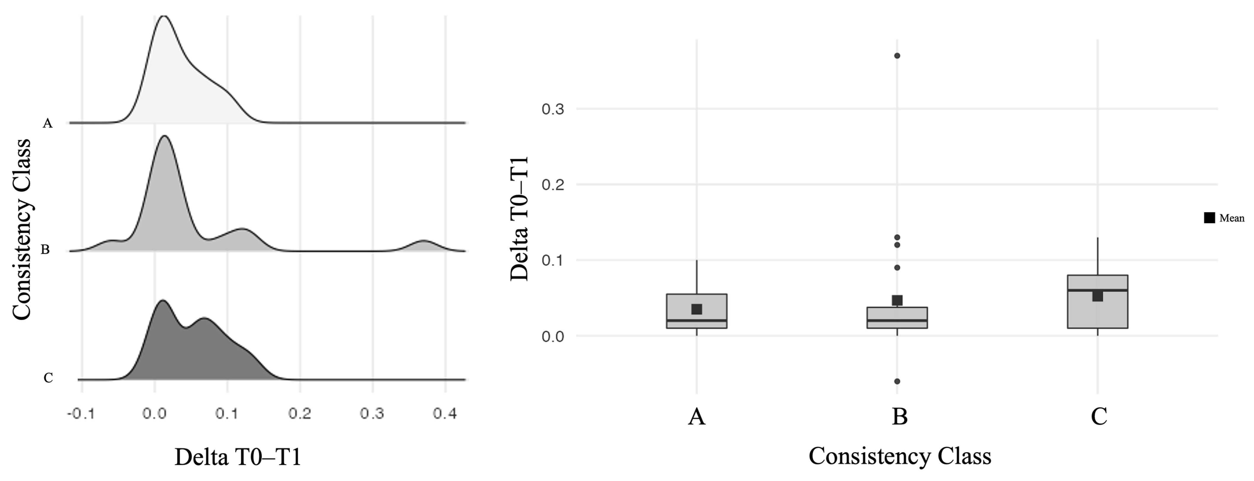| Consistency Class | B–A | −0.26317 | 0.1373 | −1.916 | 0.067 | −0.616 | −1.2794 | 0.0475 |