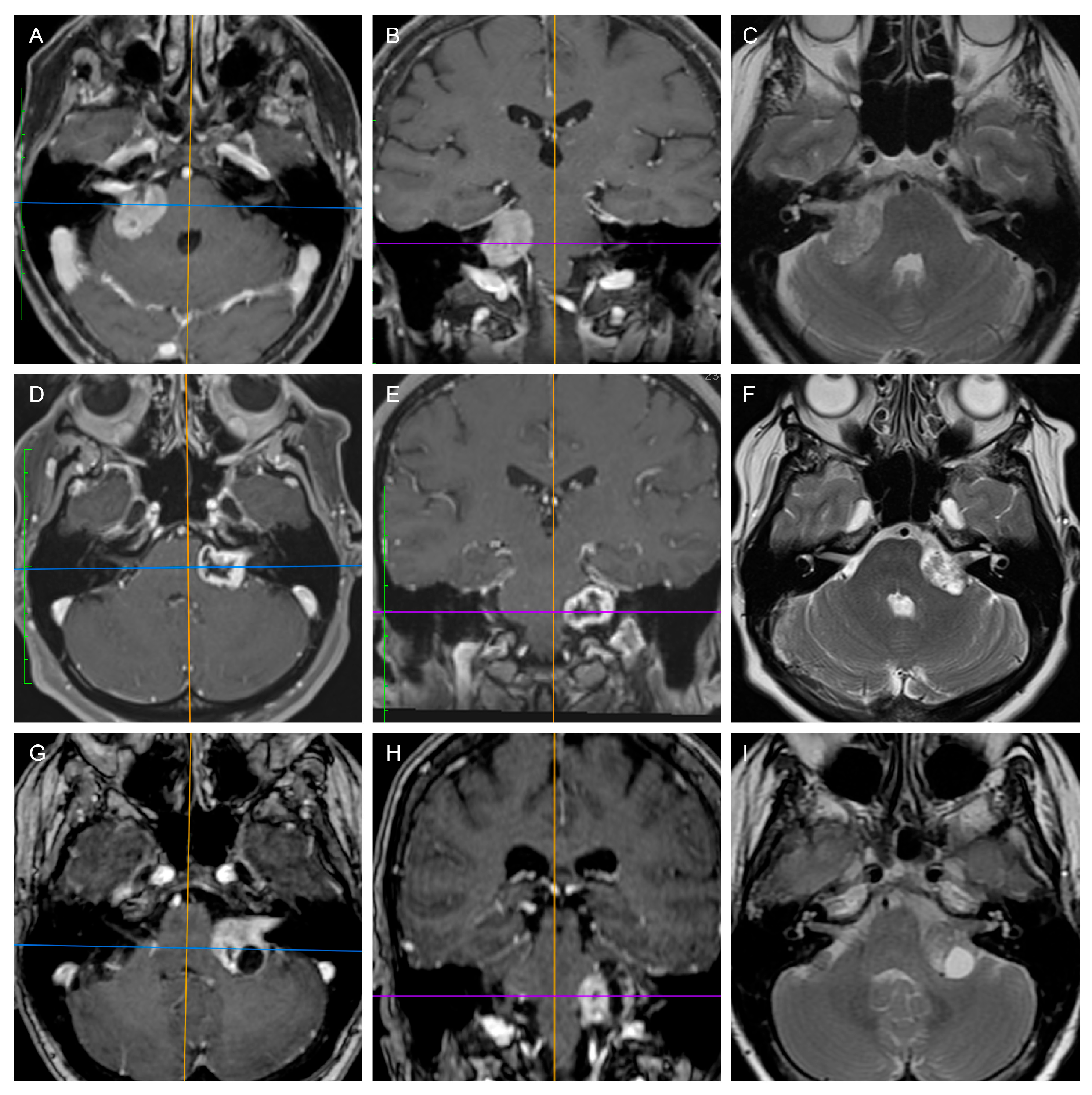 - Zhou, L.; Wang, Z.; Hu, X.; Yang, D.; Zheng, Z. Comparison of Clinical Features and Surgical Outcomes of Cystic and Solid Vestibular Schwannoma. World Neurosurg. 2025, 203, 124470. [Google Scholar] [CrossRef] [PubMed]