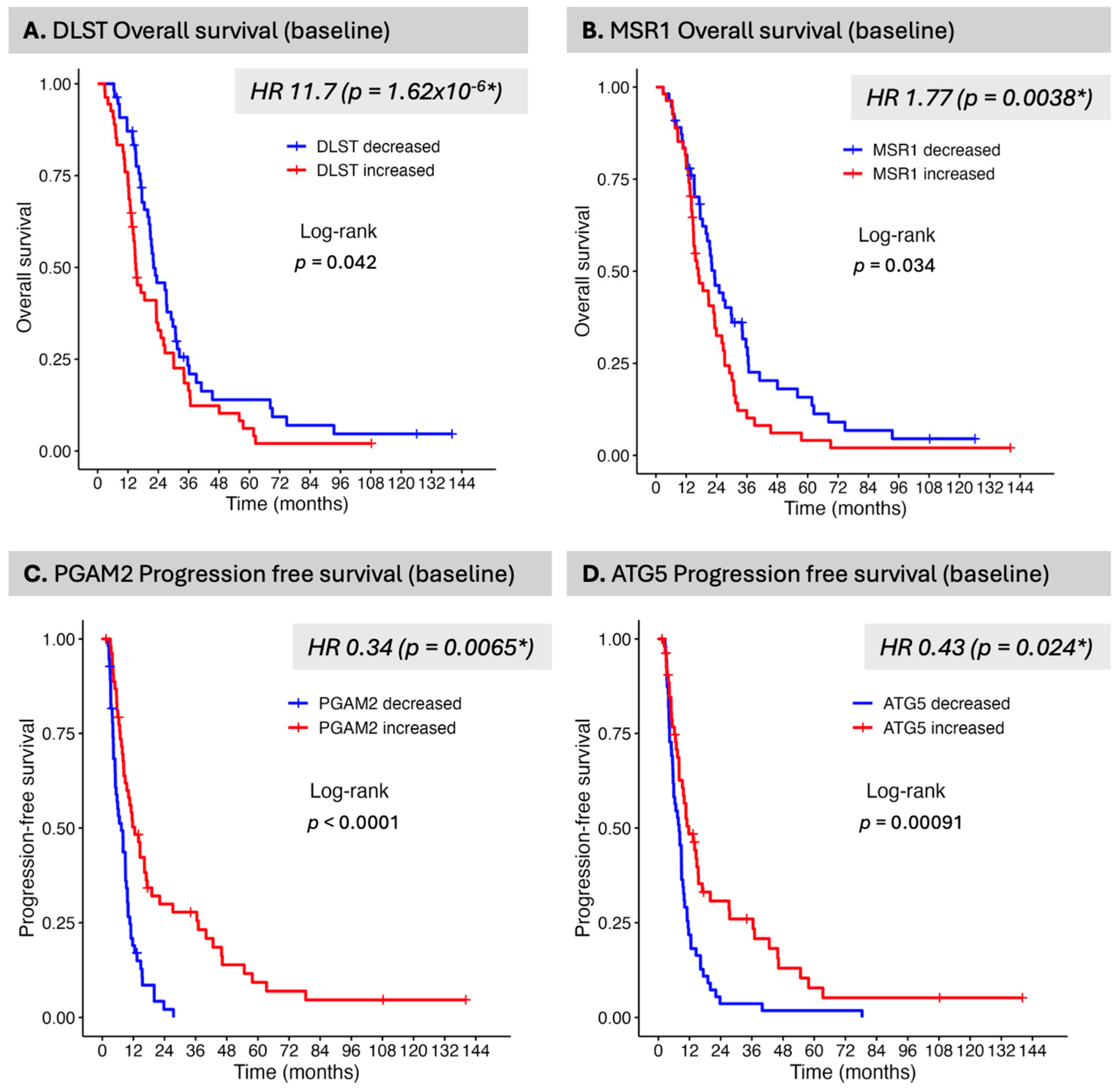 33]. MSR1 is DLST and MSR1 emerged as prominent molecules in the present analysis but indicate that validation with independent datasets will be protein-dependent. A protein may be behaving similarly in serum and in tissue in relationship to the disease states (MSR1), while another may be providing specificity with altered detection in a disease state, as in this case of GB vs. healthy individuals (possible example DLST). Additional proteins of interest identified in the present analysis include PGAM and ATG5. While neither of these had a significant FDR in the initial analysis, both had pre-CRT levels that were significant for PFS, in contrast to other more prominent molecules such as MGMT and AKT1. This finding indicates that it is critical to examine signals by multiple different means (regression and survival analysis) to enhance detection of potentially hidden biomarkers. PGAM2 (Phosphoglycerate Mutase 2), for example converts 3-phosphoglycerate to 2-phosphoglycerate in the glycolytic pathway, a critical step that mediates glycolysis, the primary mode of energy generation in malignant conditions. PGAM2 is phosphorylated by PAK1, marking it for ubiquitin-mediated degradation [