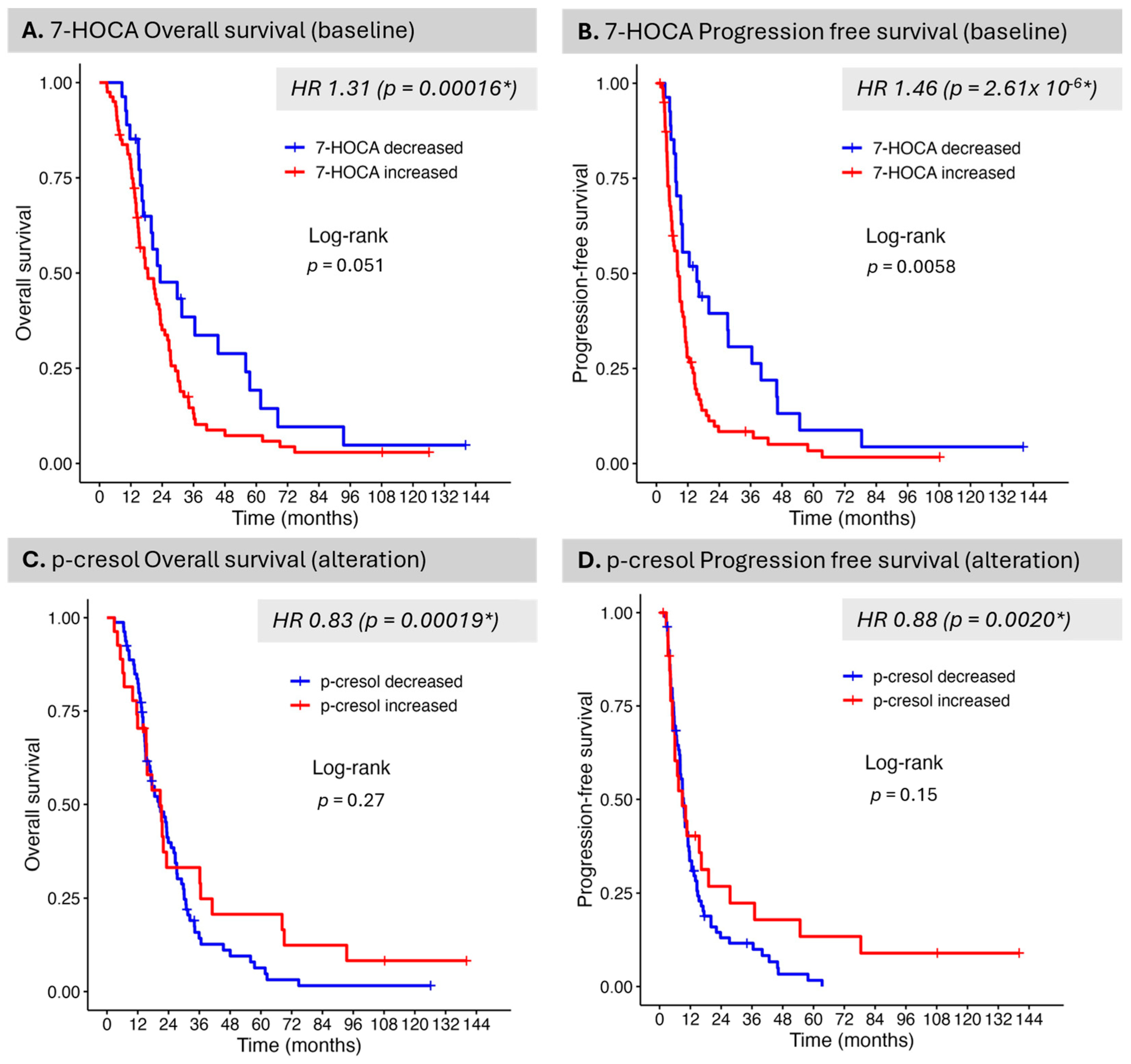 41]. This finding is supported by serum data in the present study with increased levels associated with detriment in OS and PFS. Previous research has also shown that 7-HOCA can be employed as a marker of blood–brain barrier dysfunction, with data supporting the flux of 7-HOCA from the brain against a concentration gradient, given its preferential binding to albumin [